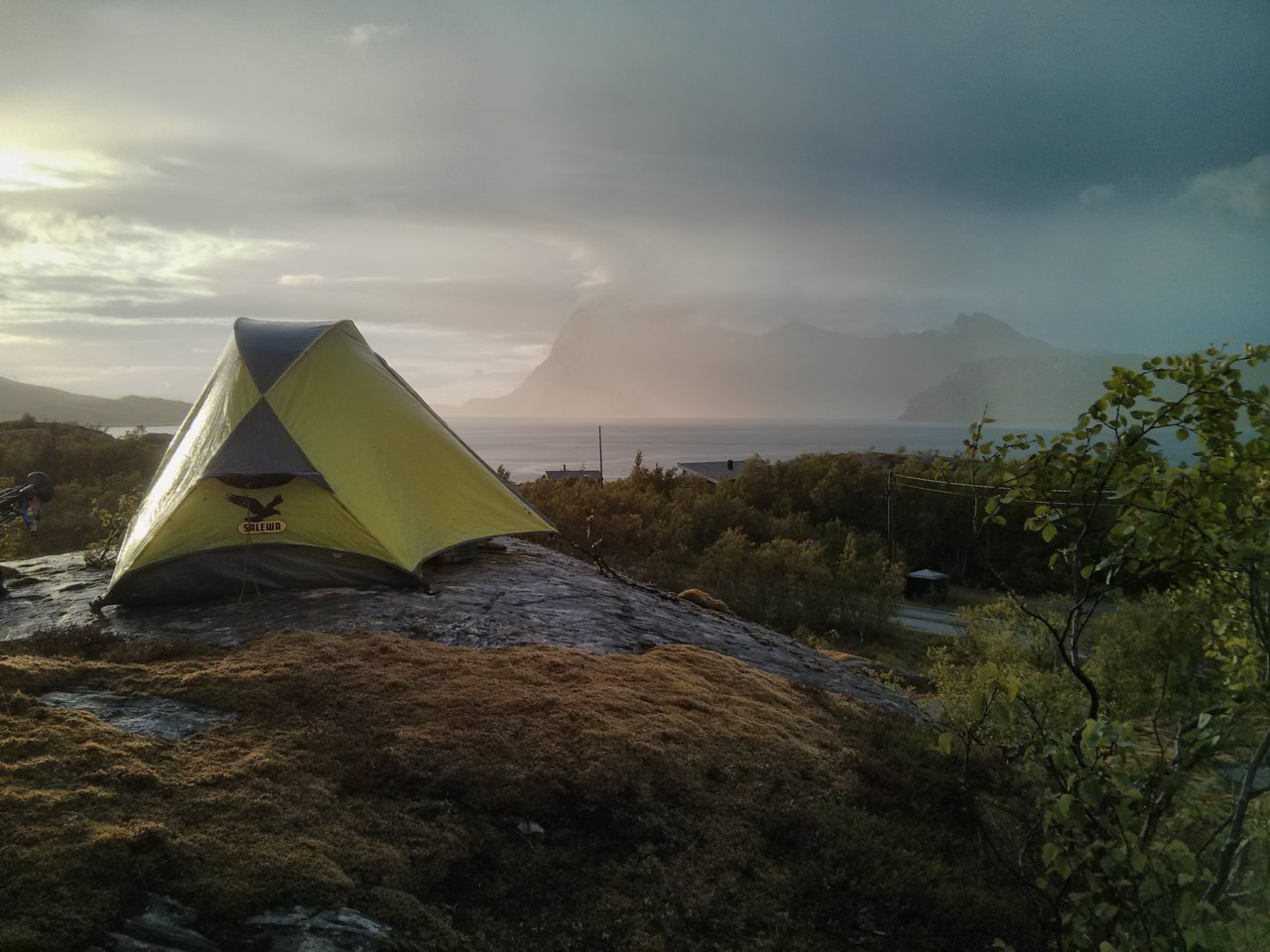 ein Fels zum Zelten kurz vor Kilboghavn, dann mit der Fähre über den Polarkreis nach Jetvik, weiterhin Küstenstraße Nr. 17,