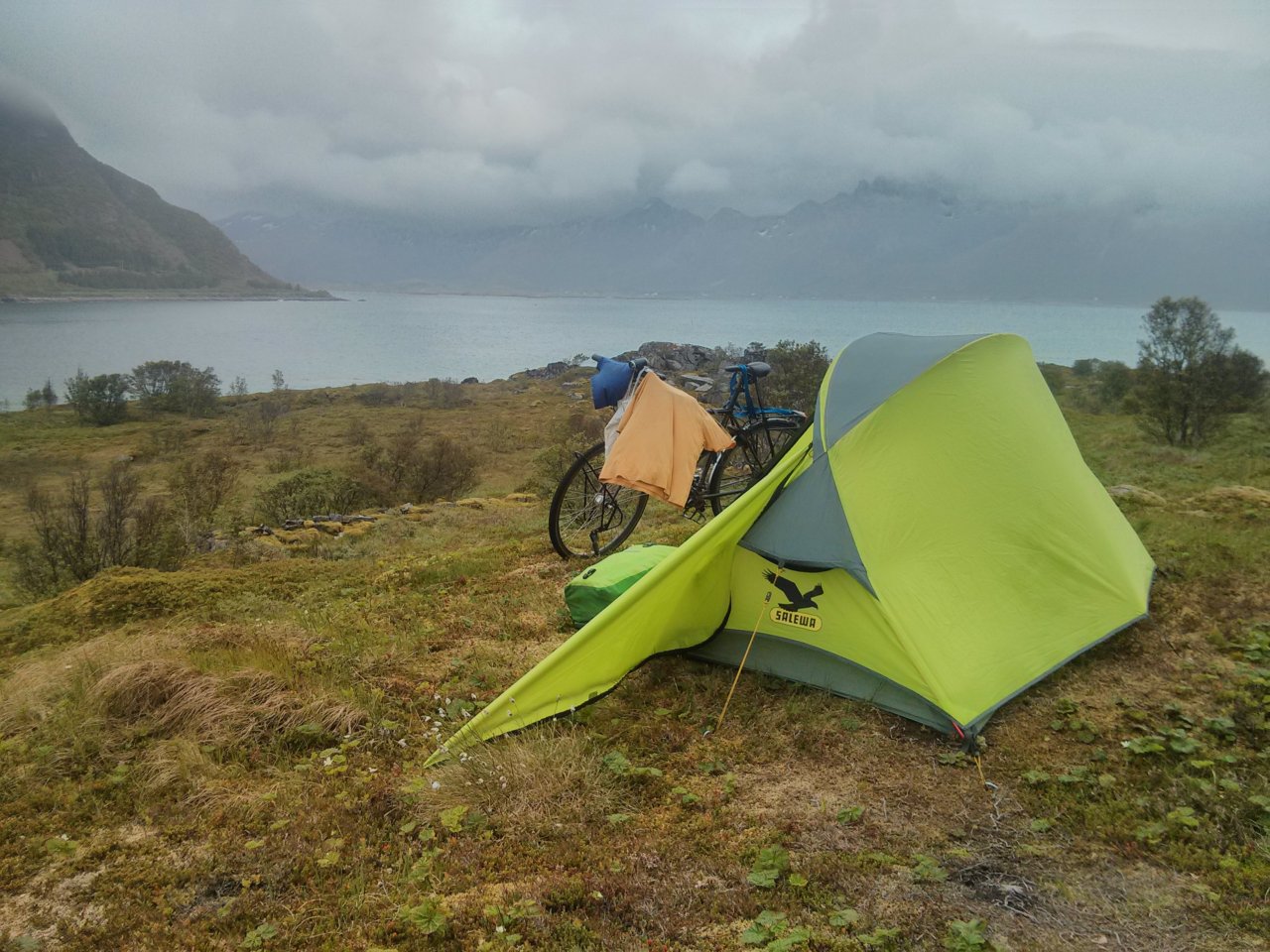 Mittagspause mit Zeltaufbau wegen Wind und Kälte, am Sundklakkstraumen auf Vestvågøy , Blick auf Austvågøya