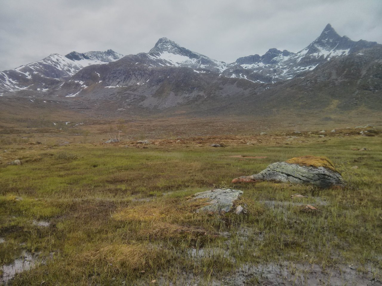 Schneefall auf den Gipfeln der Insel Kvaløya, kurz vor Tromsø, Im Hintergrund der 1041 m hohe Skittentinden