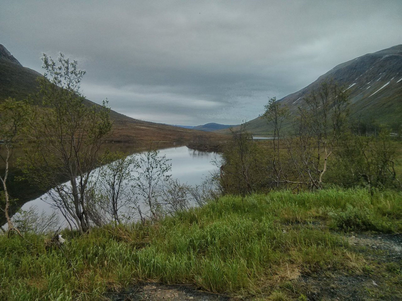 Schneefall auf den Gipfeln der Insel Kvaløya, kurz vor Tromsø, Blick Richtung Kaldfjorden (Norden) übers Kattfjordvatnet