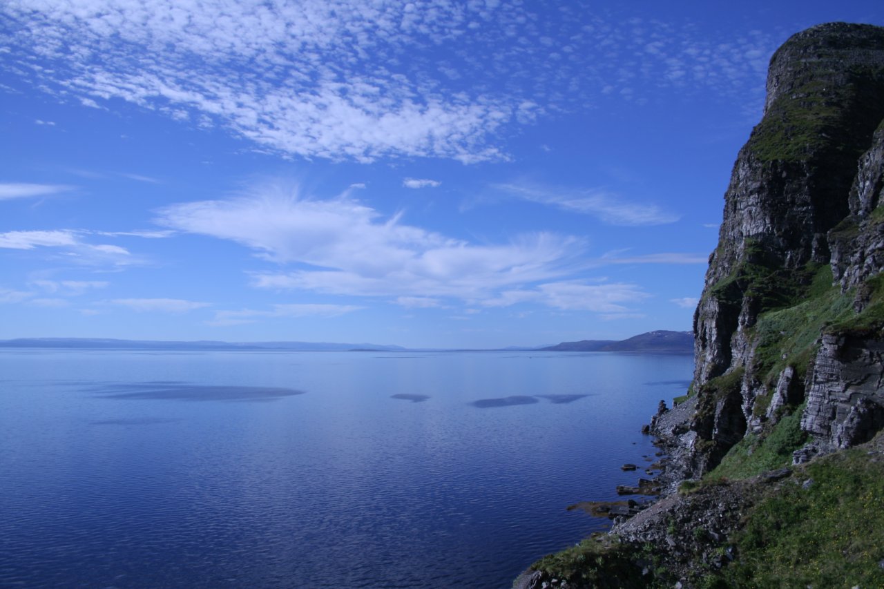 Sittarvuotna, Skarvbergvika, wunderschöne Bucht mit bestem Wasser. Blick auf den Porsangerfjord